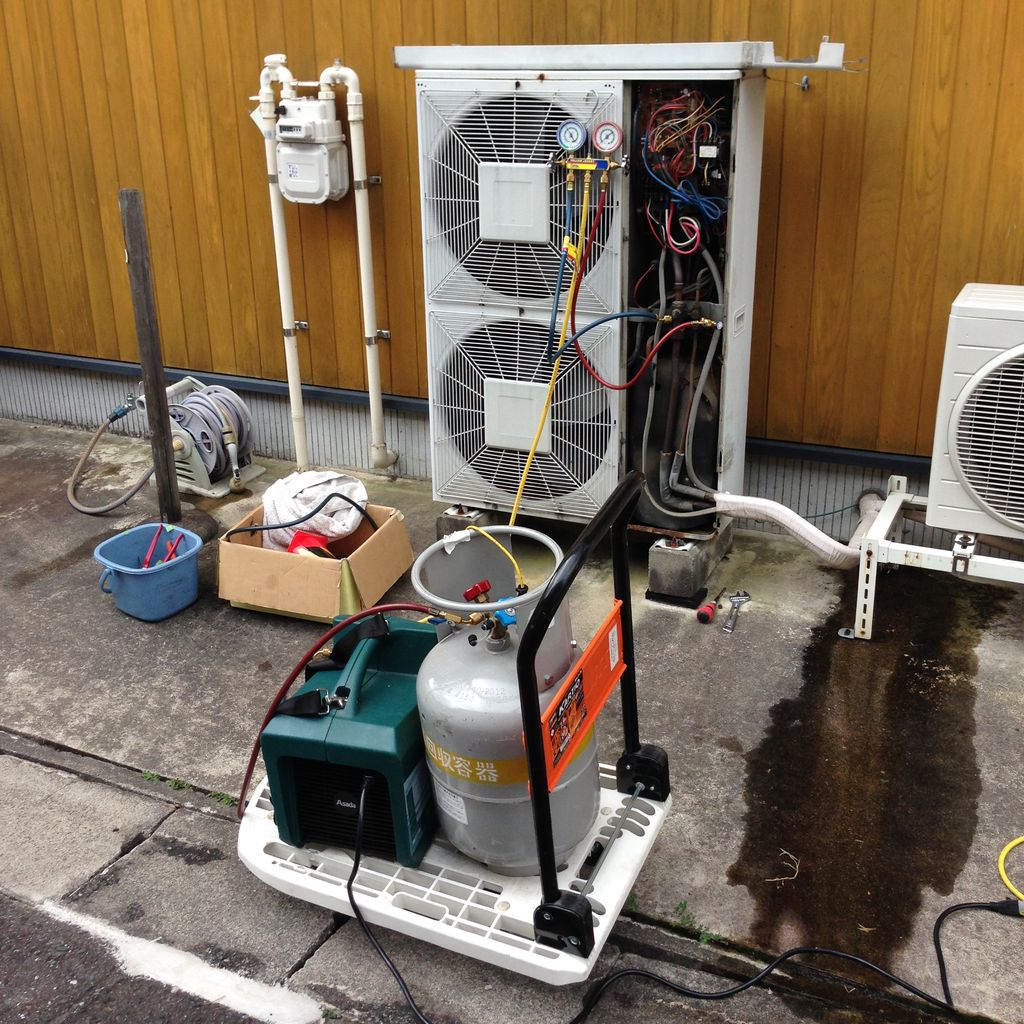 故障している機械を取り外す前に、室外機からフロンガスを回収します。